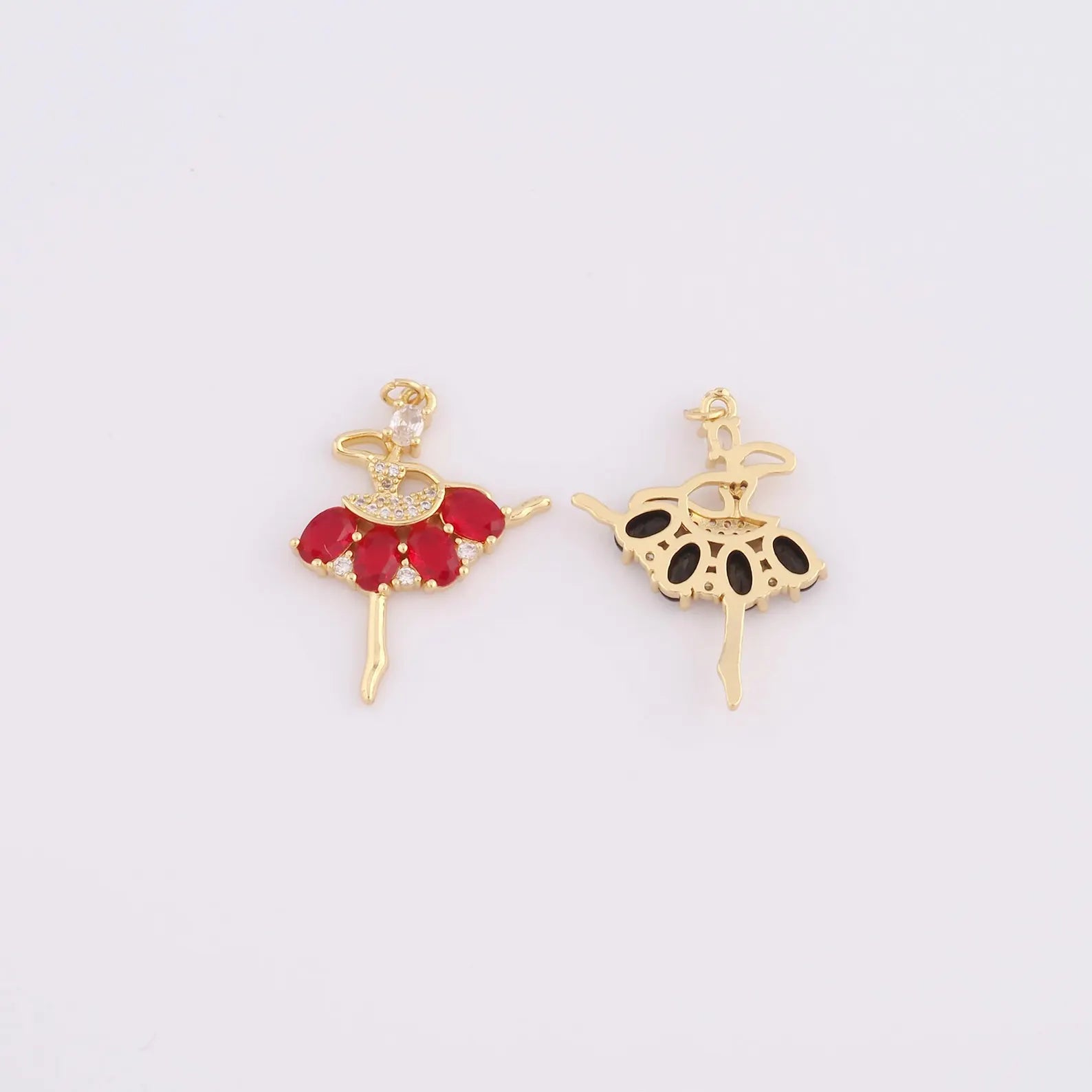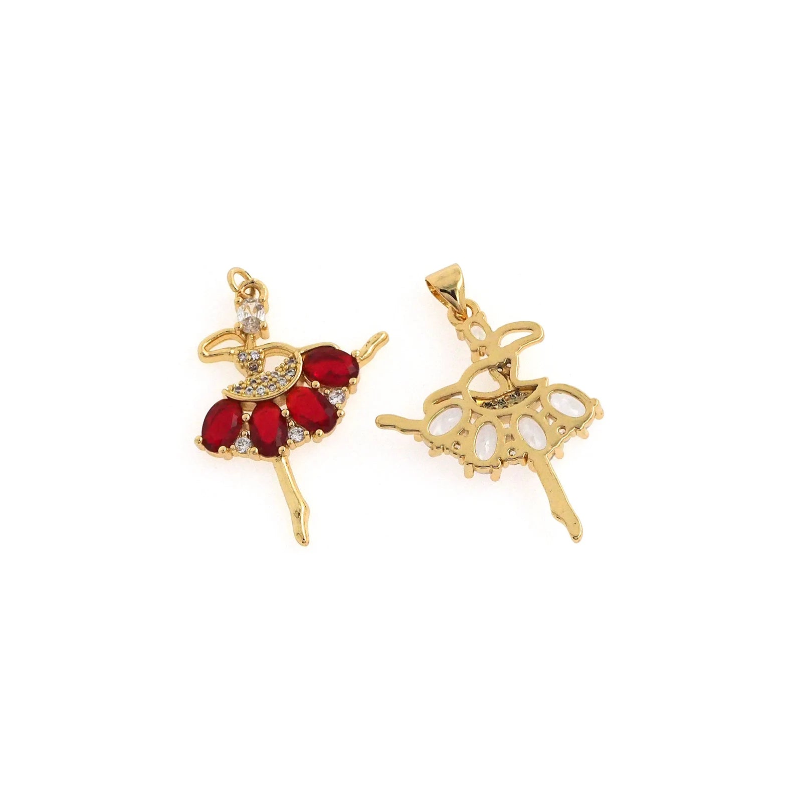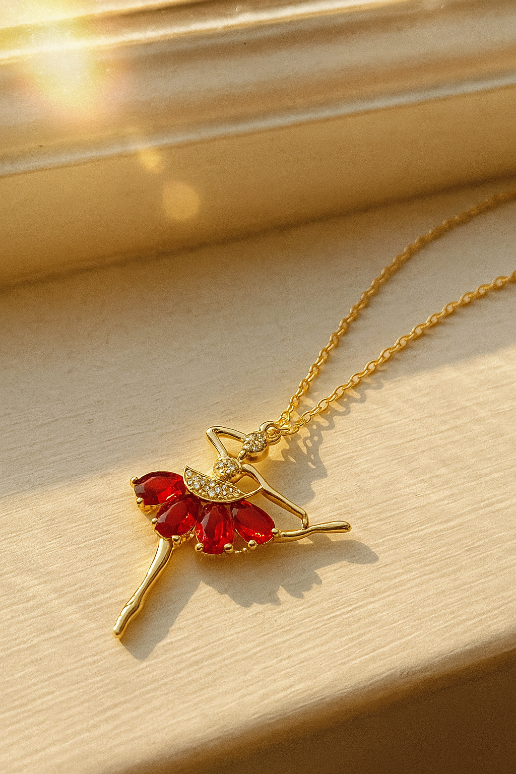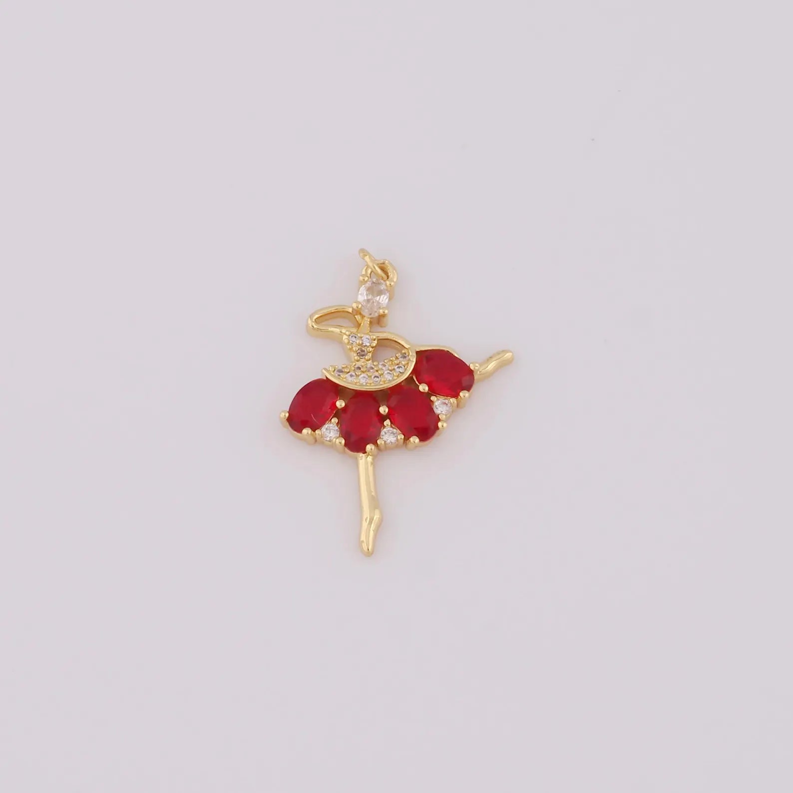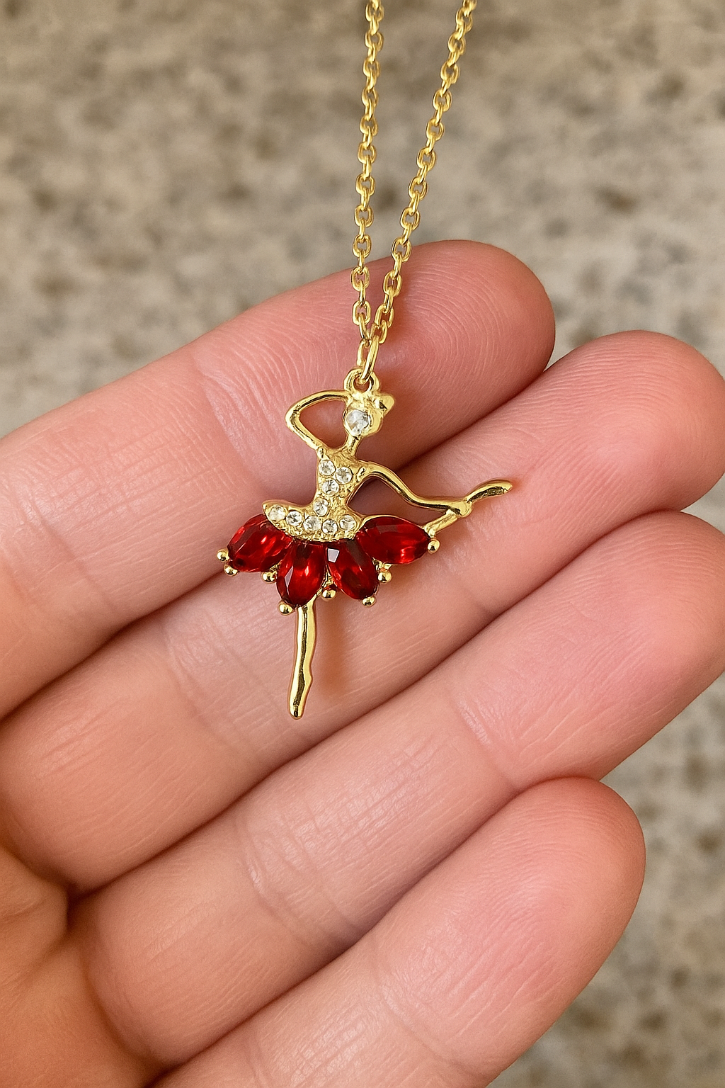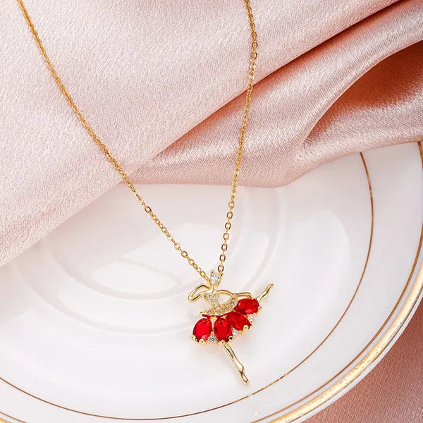 The Red Ruby Ballerina Necklace is a masterpiece of elegance and sophistication. Its intricately designed ballerina pendant is gracefully embellished with radiant red zircon stones, symbolizing both passion and precision. With a luxurious gold-plated finish, this necklace offers a timeless allure that adds a touch of brilliance to any look.