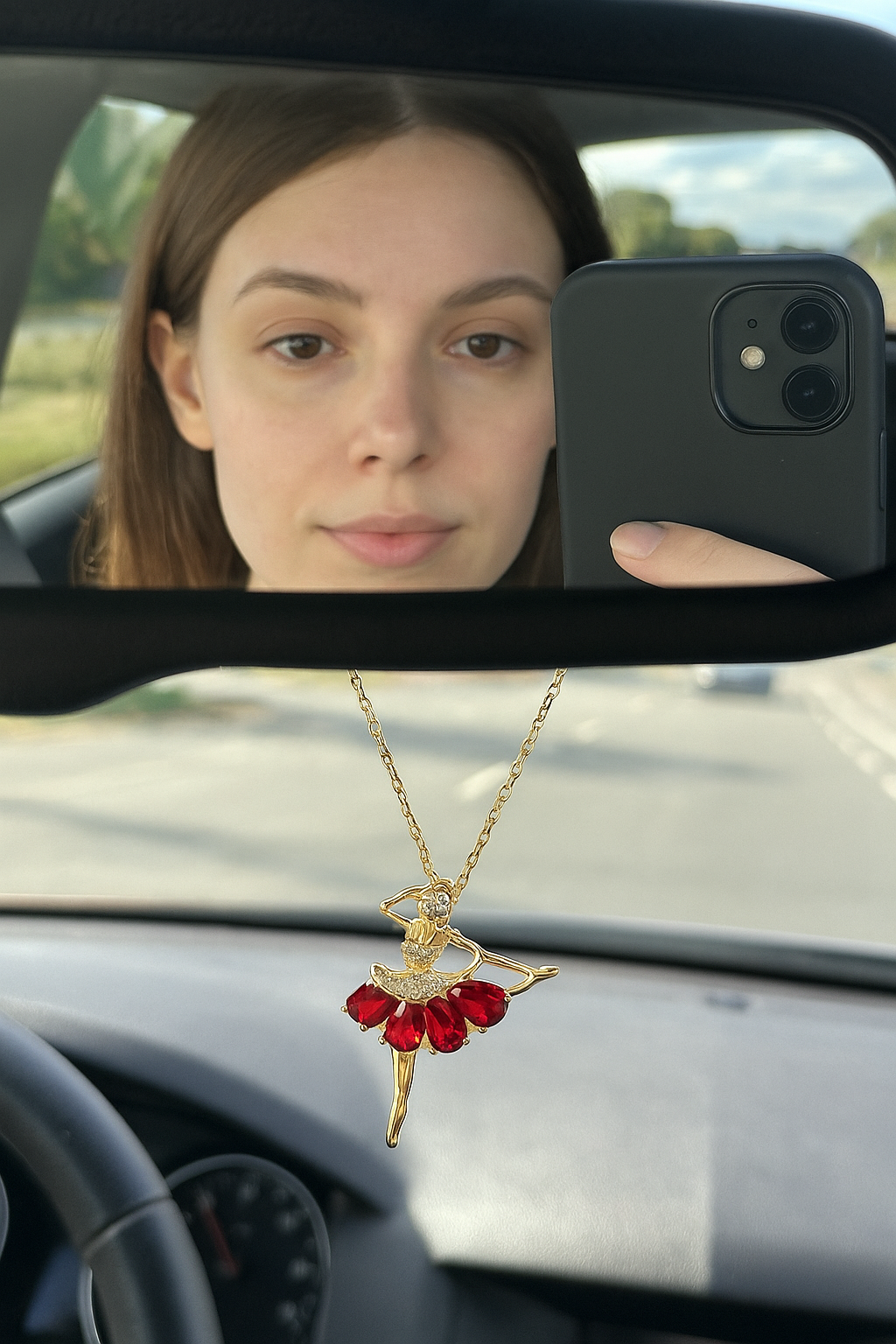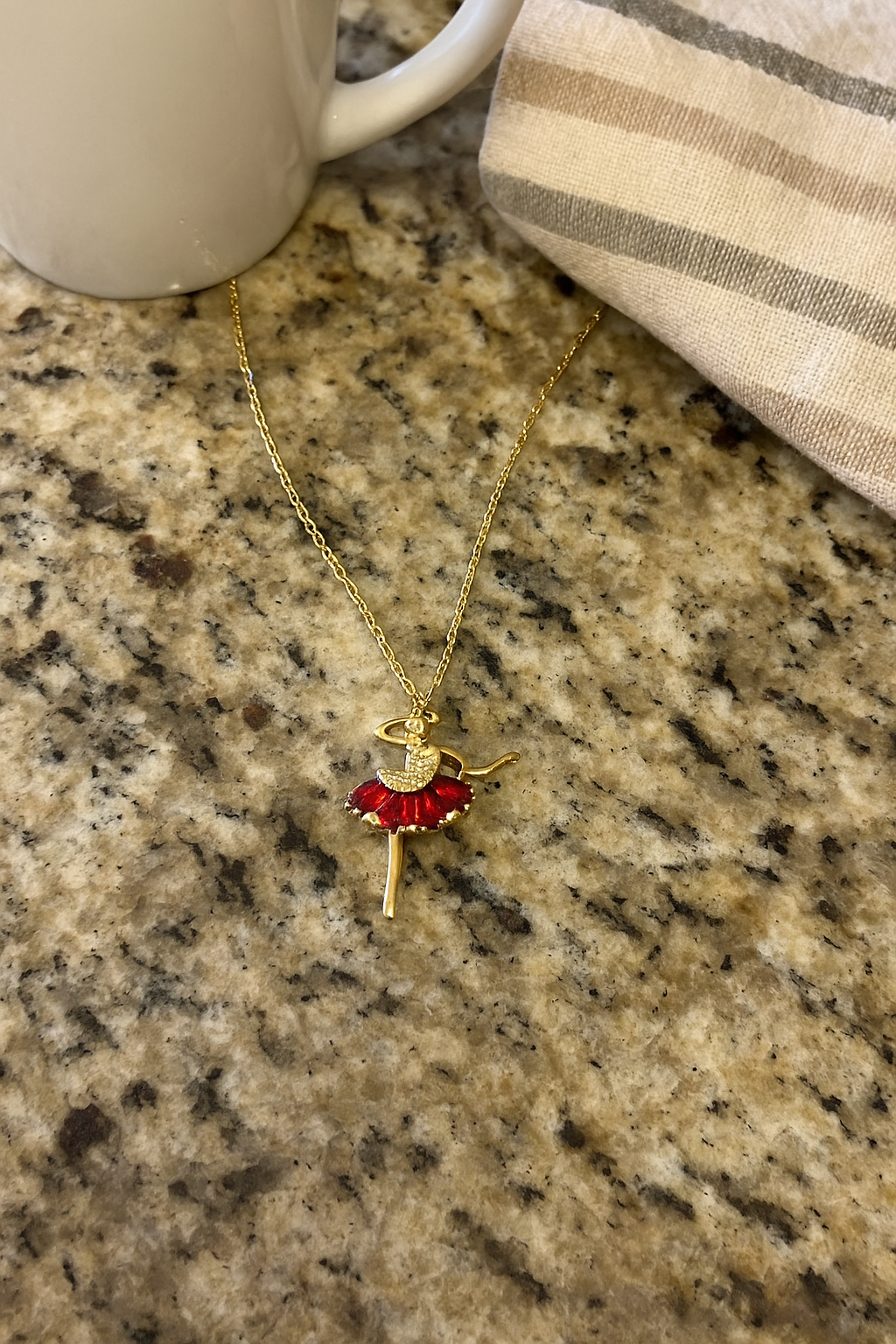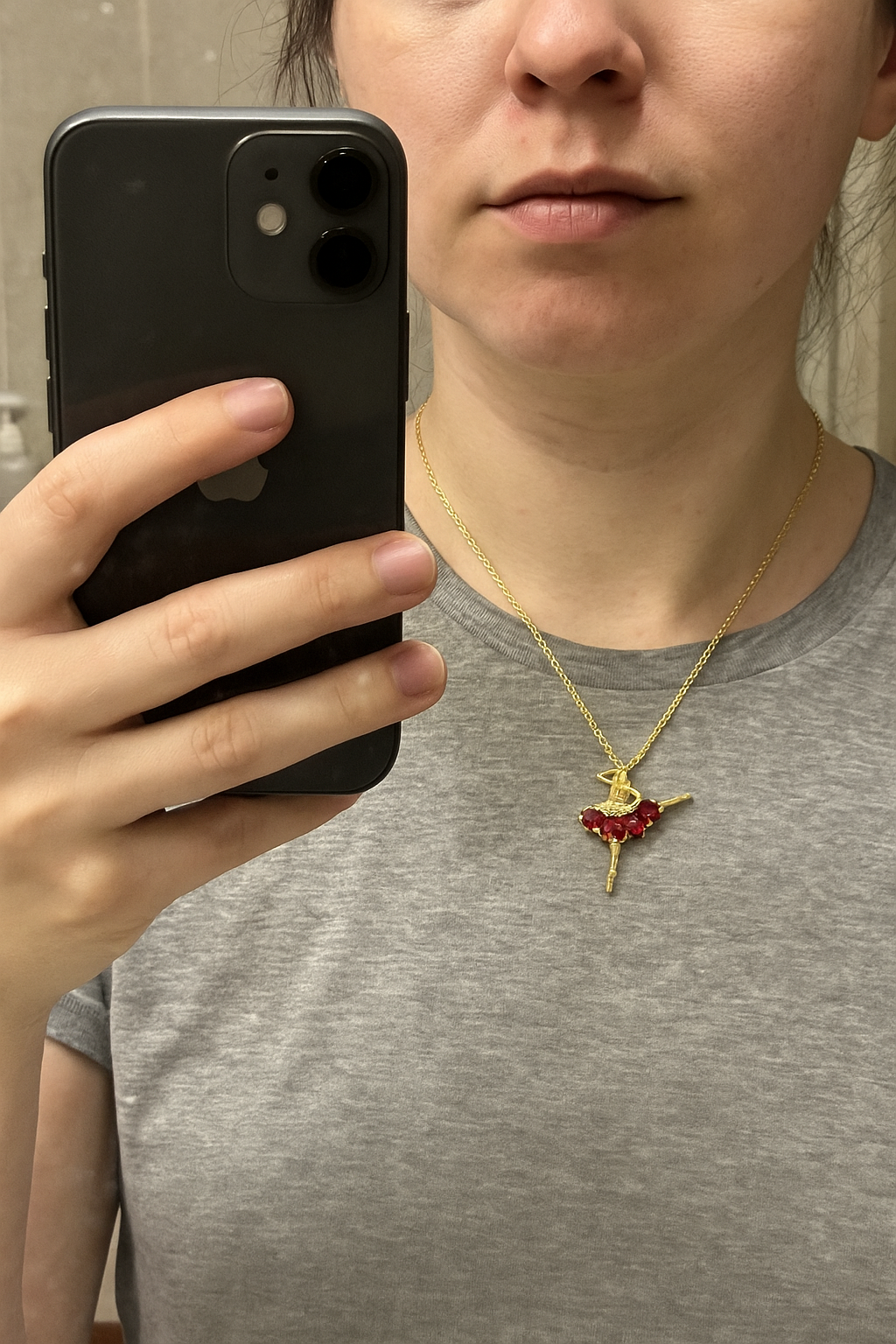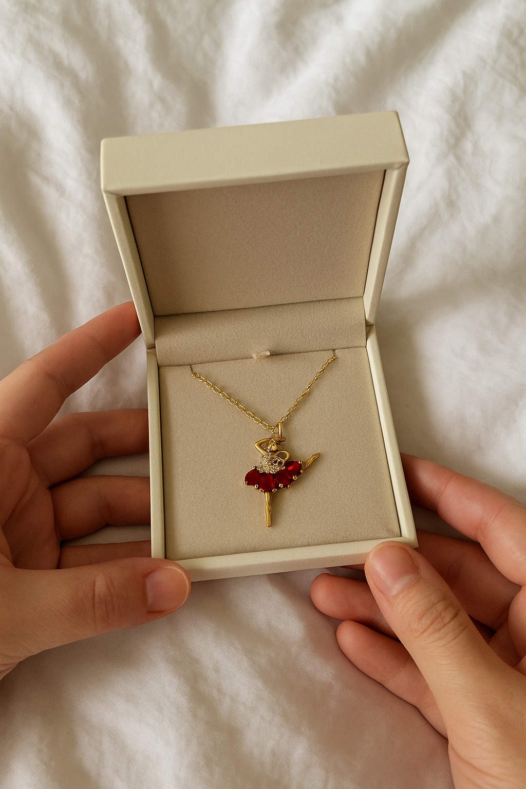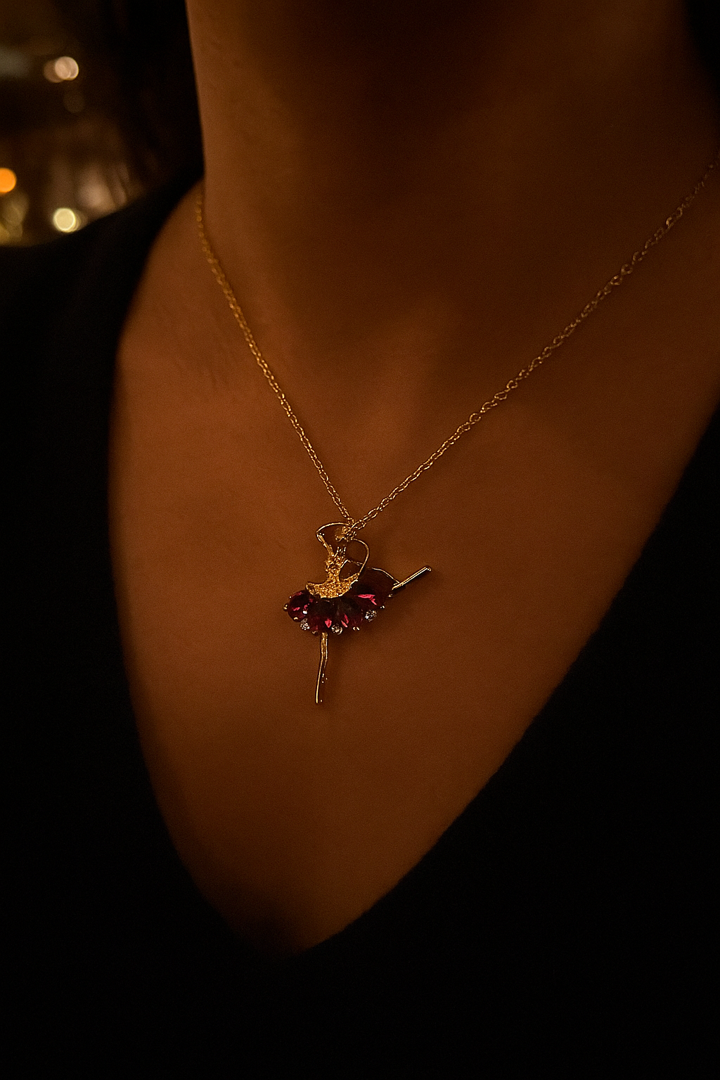 The Red Ruby Ballerina Necklace is a masterpiece of elegance and sophistication. Its intricately designed ballerina pendant is gracefully embellished with radiant red zircon stones, symbolizing both passion and precision. With a luxurious gold-plated finish, this necklace offers a timeless allure that adds a touch of brilliance to any look.