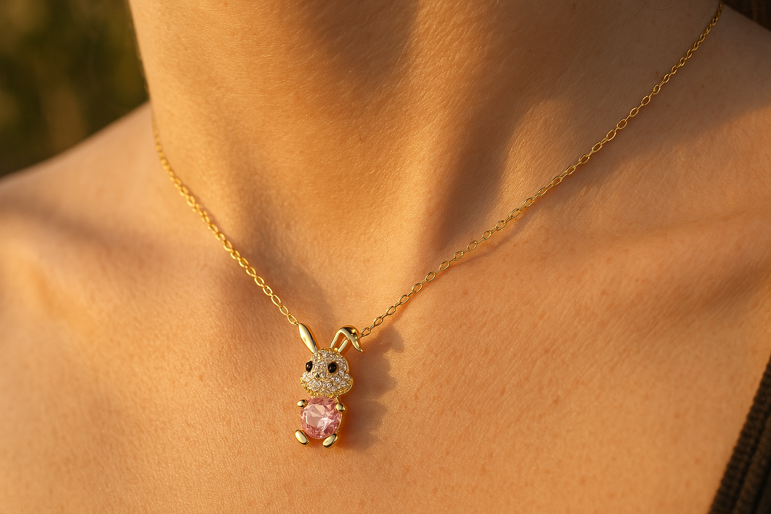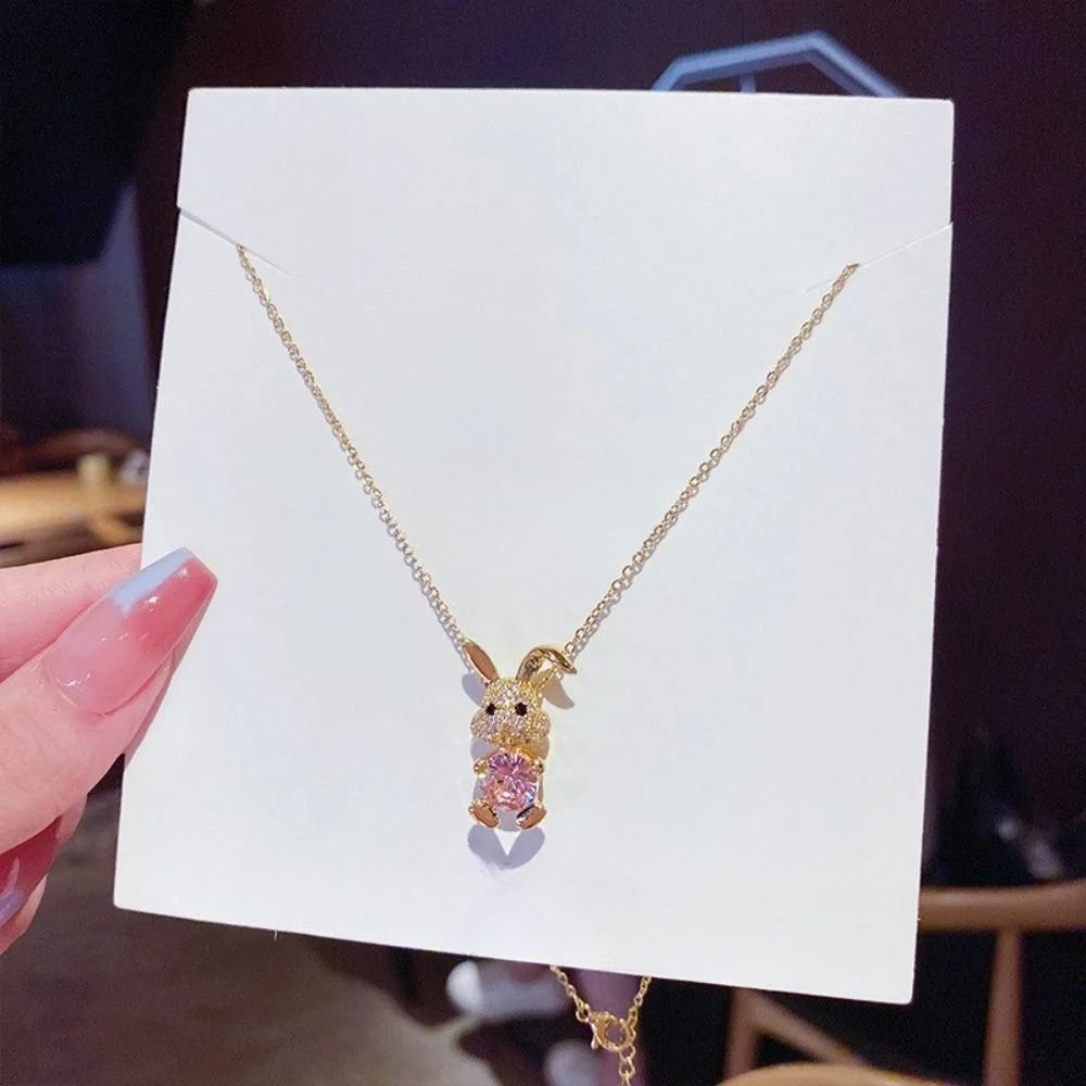 The Pink Gem Bunny Necklace brings playful elegance to your jewelry collection. This charming bunny pendant is embellished with shimmering crystals and a stunning pink zircon stone, creating an adorable yet sophisticated look. Its luxurious gold-plated finish adds a touch of glamour to any outfit, making it the perfect accessory for special occasions or everyday wear.