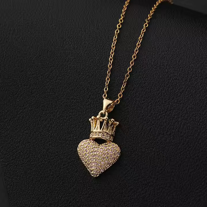 Radiate confidence and elegance with the Crowned Heart Pendant Necklace. This beautifully detailed piece combines two powerful symbols — the heart and the crown — into one radiant statement of love, empowerment, and royalty. The pendant sparkles with meticulously set zircon stones, designed to catch the light (and attention) wherever you go.