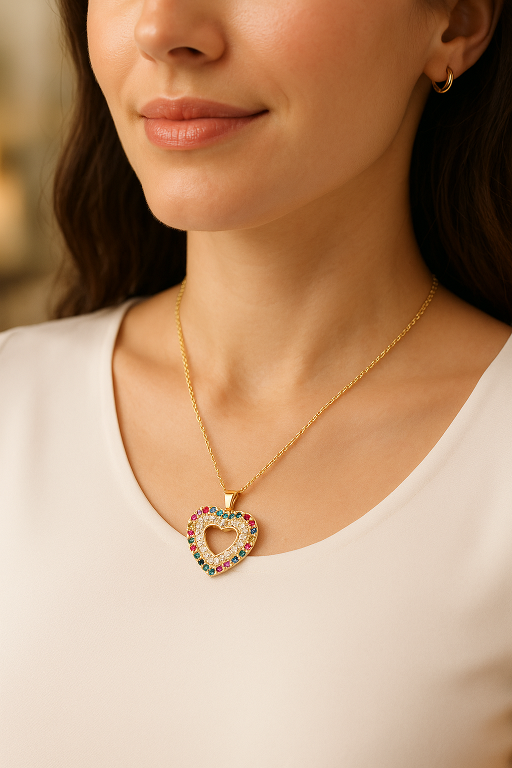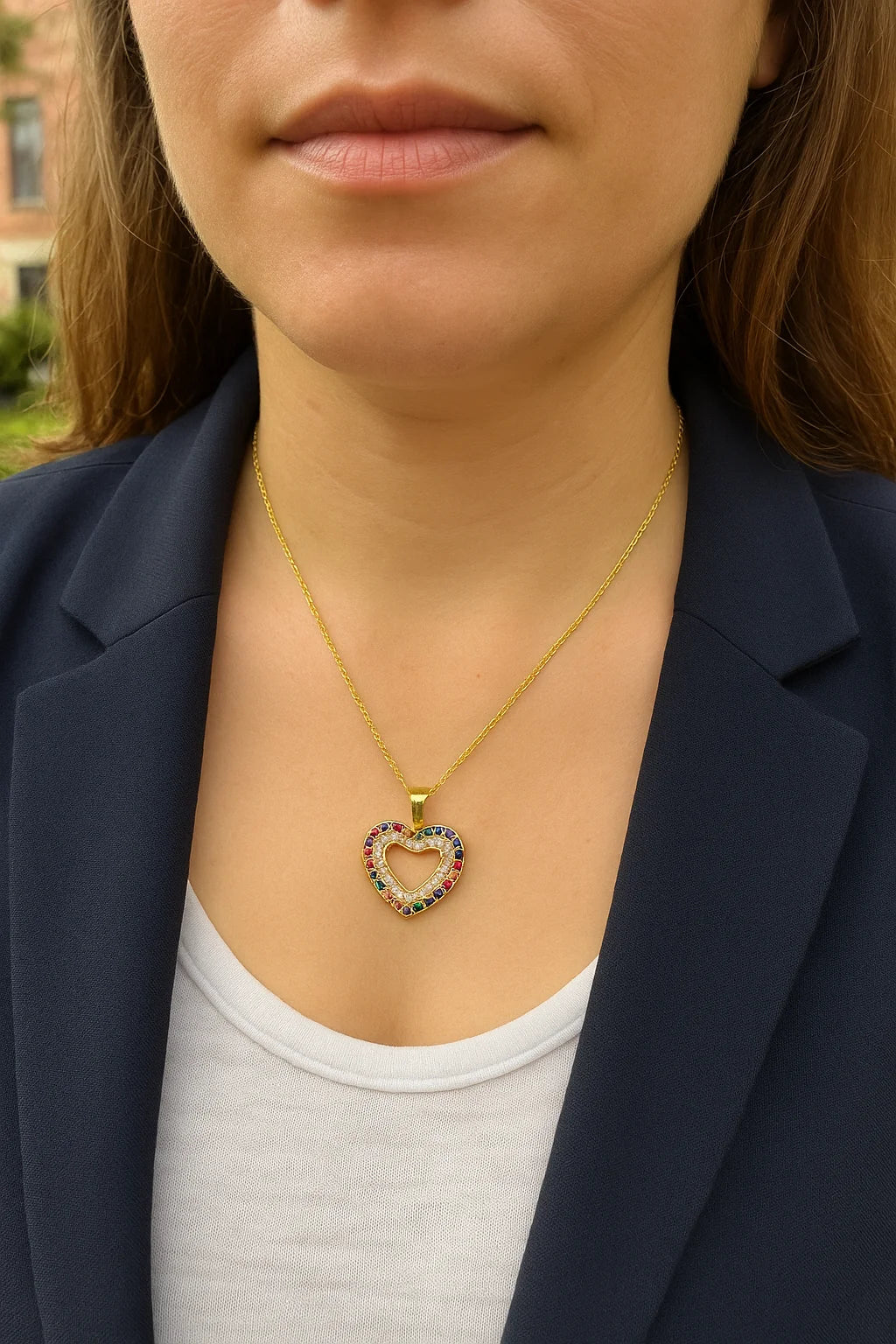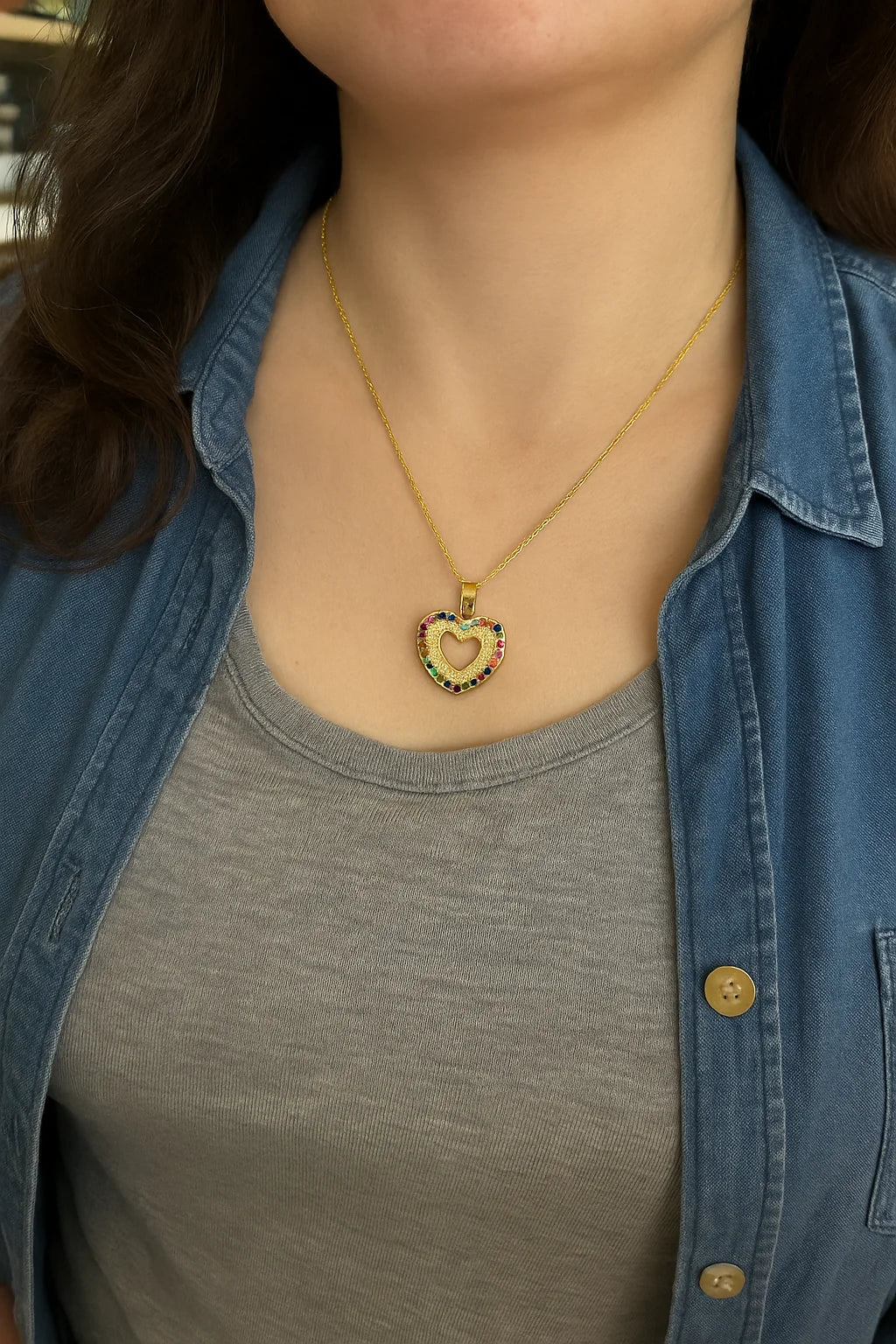 Express your individuality with the stunning Radiant Rainbow Heart Pendant Necklace. This eye-catching piece combines the timeless elegance of gold plating with a playful touch of multicolored zirconia crystals, creating a look that’s both sophisticated and fun. Whether you’re dressing up for a special occasion or adding sparkle to your everyday style, this necklace promises to turn heads wherever you go.