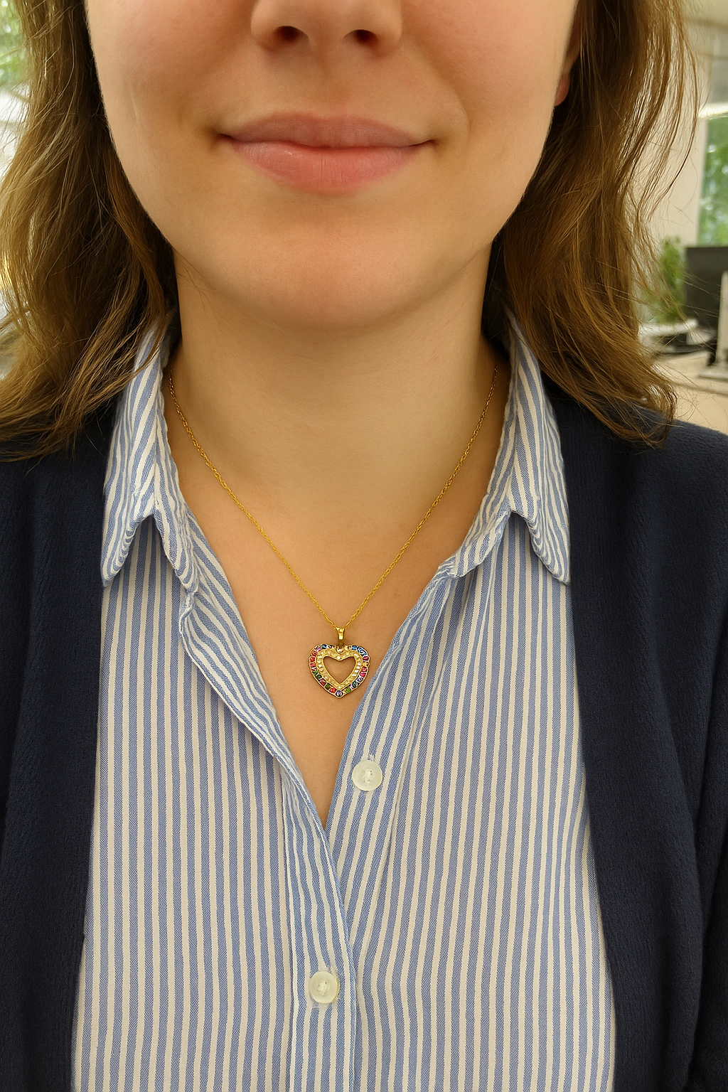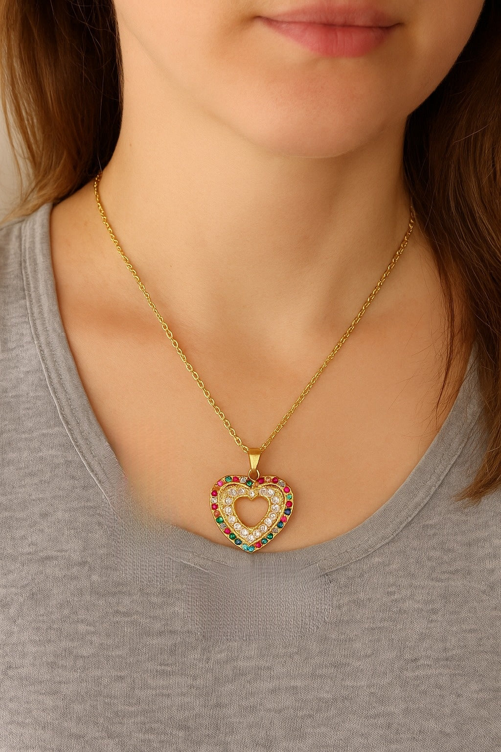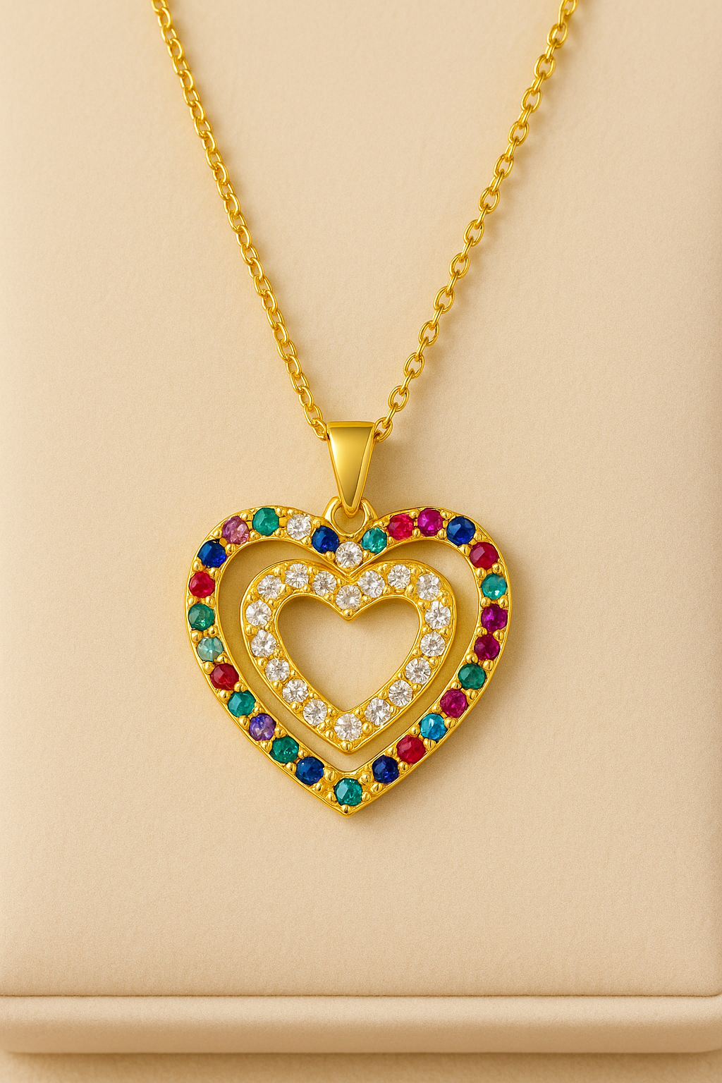 Express your individuality with the stunning Radiant Rainbow Heart Pendant Necklace. This eye-catching piece combines the timeless elegance of gold plating with a playful touch of multicolored zirconia crystals, creating a look that’s both sophisticated and fun. Whether you’re dressing up for a special occasion or adding sparkle to your everyday style, this necklace promises to turn heads wherever you go.
