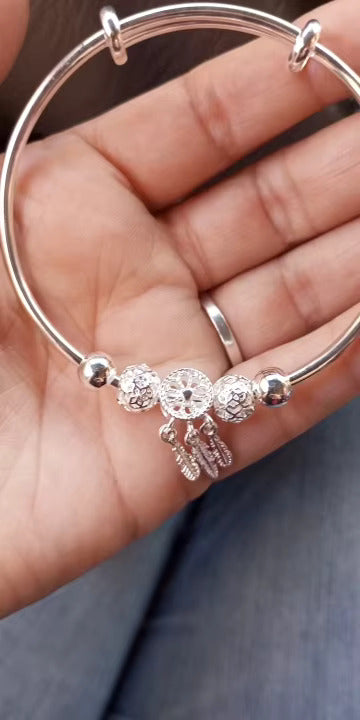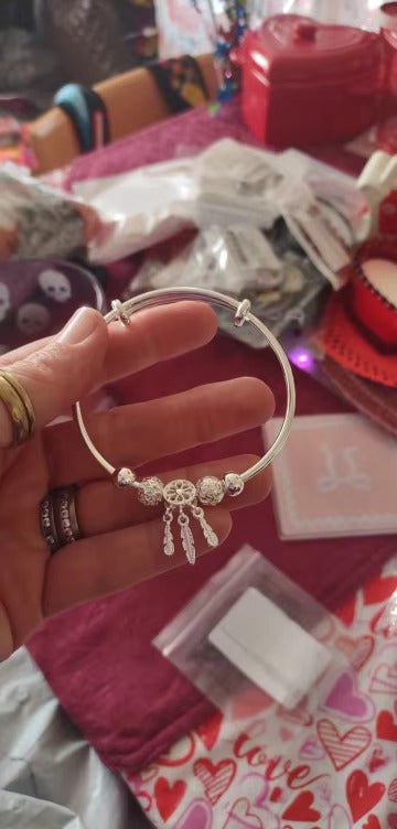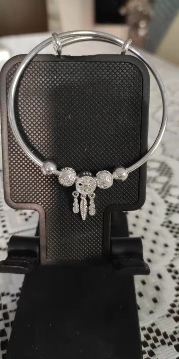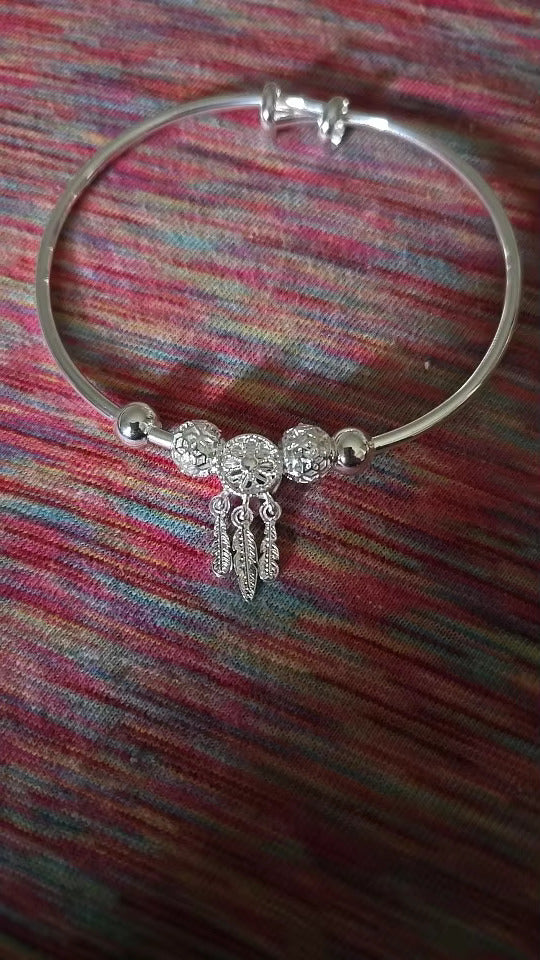 A blend of sophistication and symbolism, this bangle is designed with a detailed dreamcatcher charm and dangling silver feathers. The polished silver beads add an elegant touch, while the adjustable design ensures a perfect fit. Whether worn alone or stacked, it brings bohemian charm with modern refinement.