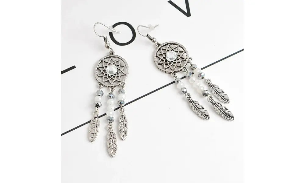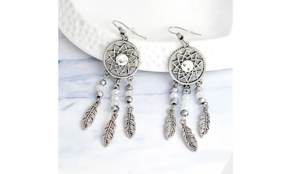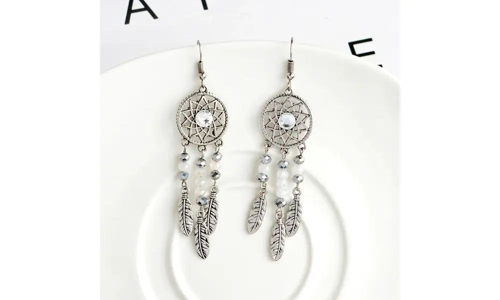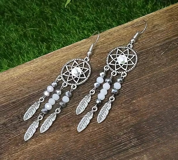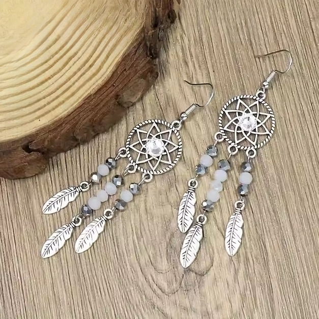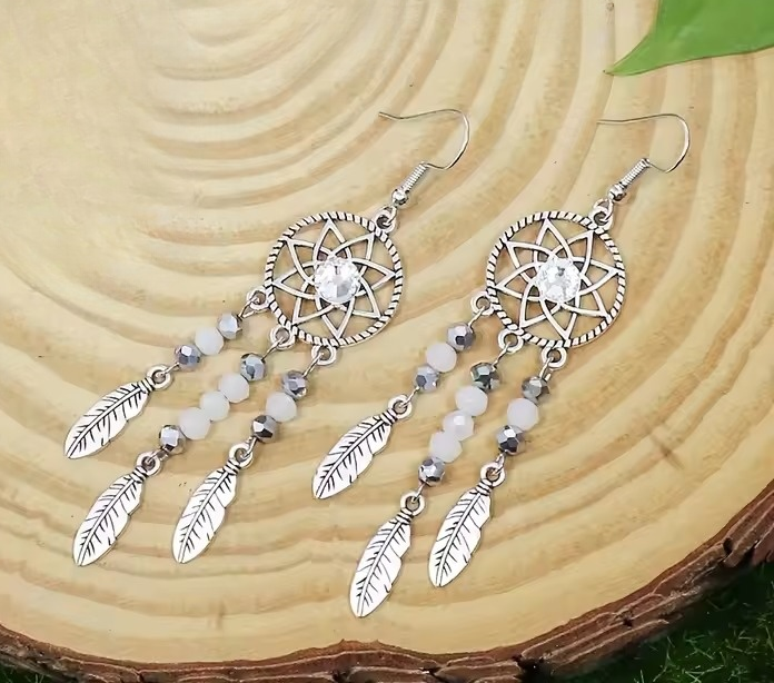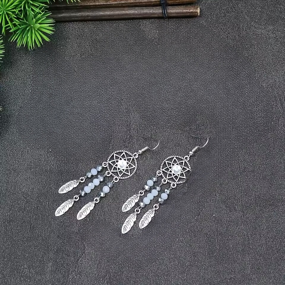 Crafted with a geometric dreamcatcher design, these earrings symbolize protection, balance, and positivity. The delicate beads and cascading feathers create a graceful, boho-chic movement that complements any casual or festival-inspired outfit. The lightweight zinc alloy construction ensures all-day comfort, making them an effortless yet eye-catching addition to your collection.