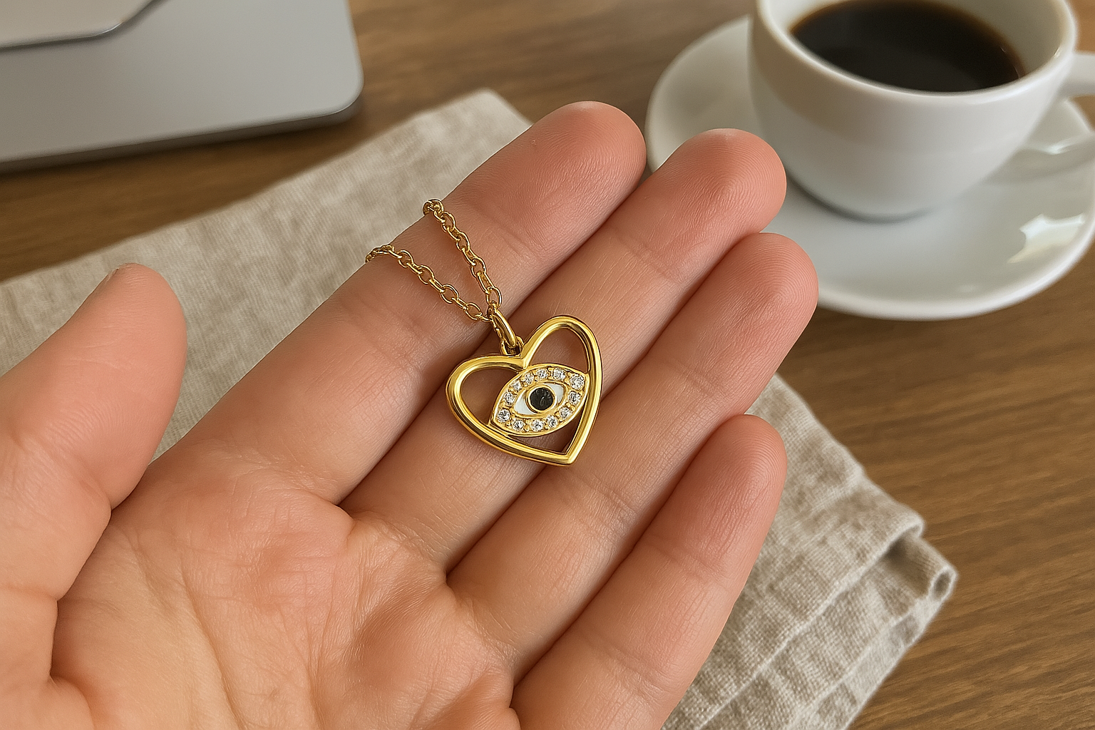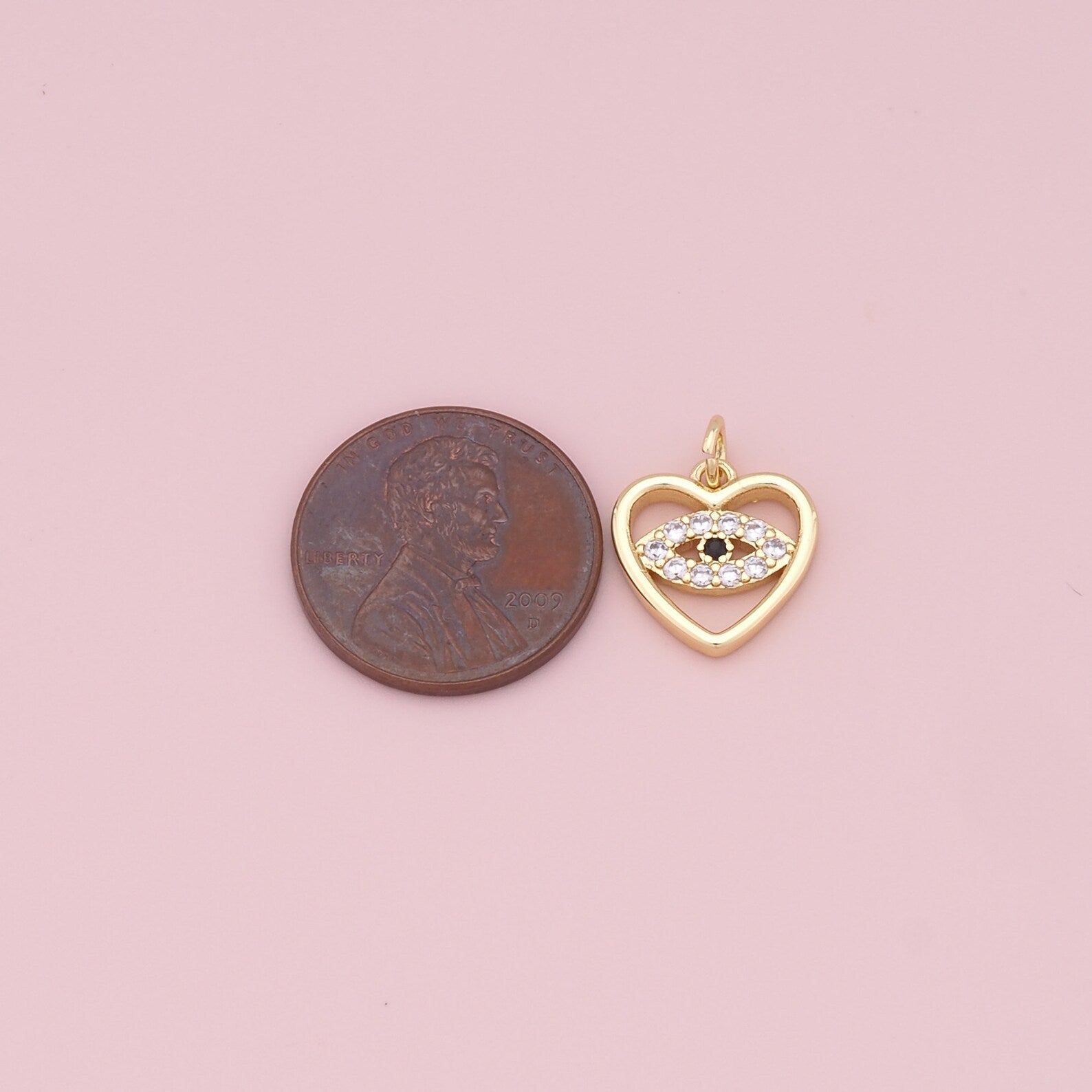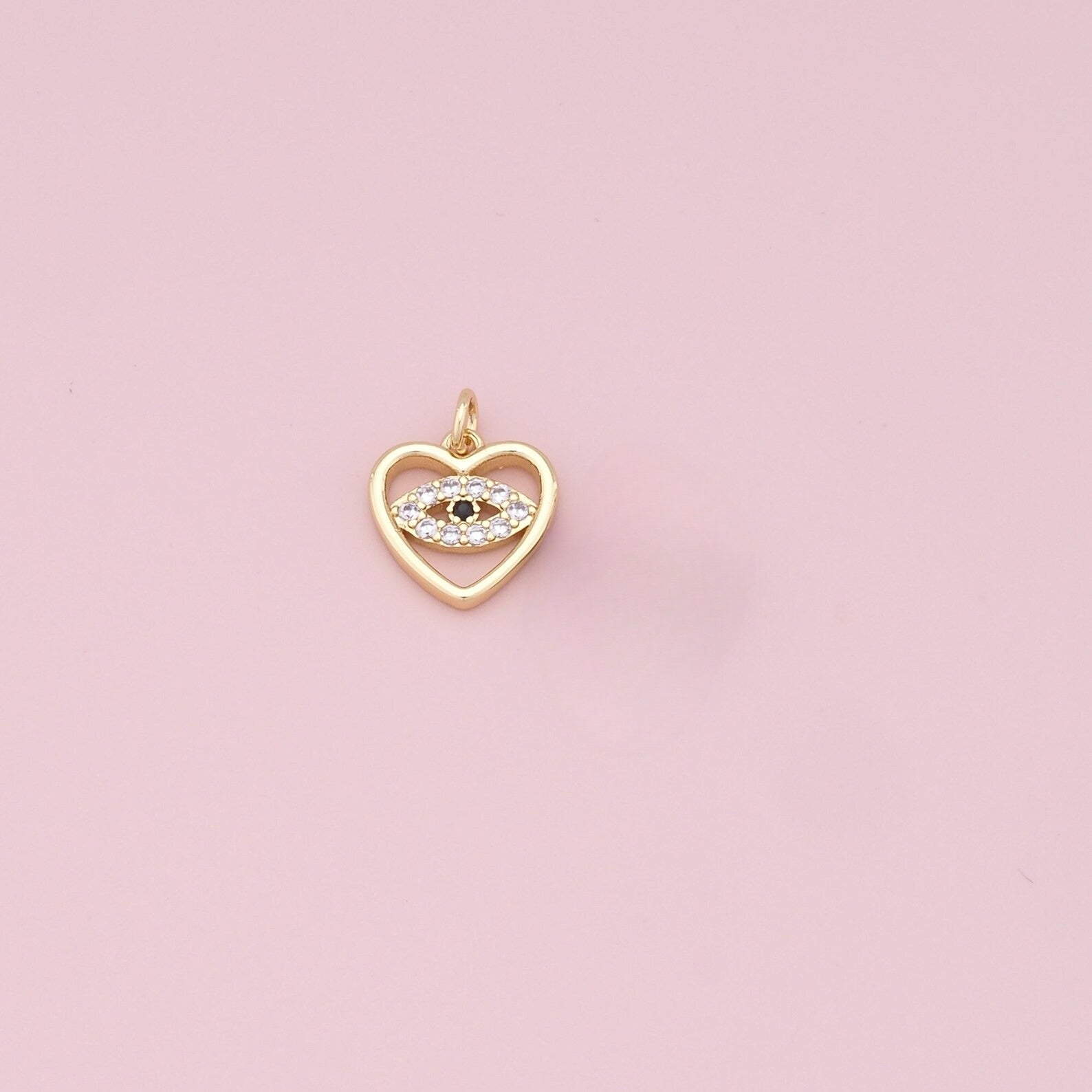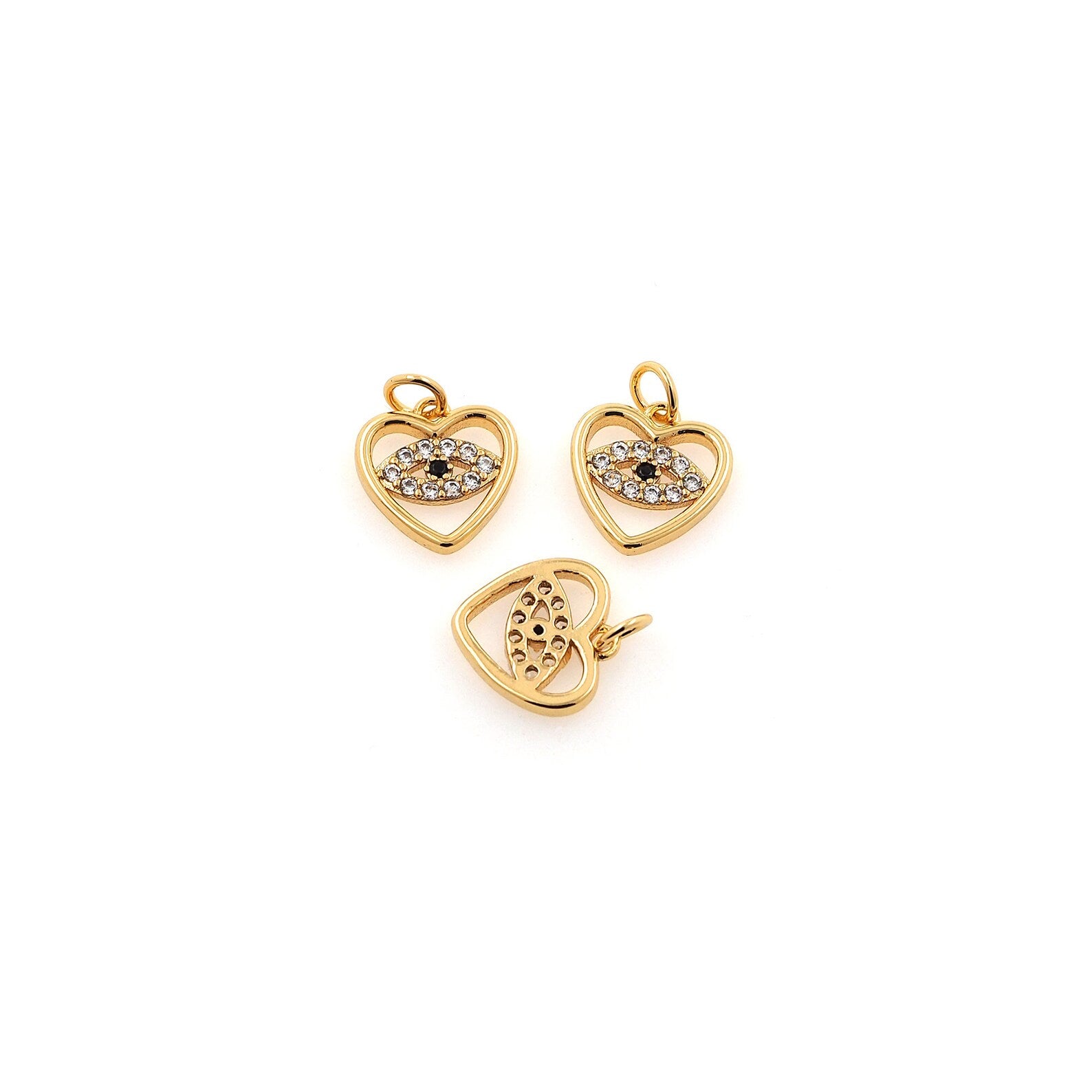 The Gold Evil Eye Heart Charm blends two ancient symbols — love and protection — into one modern statement. With brilliant zircon detailing and a compact size of 16x12.5x2mm, it adds elegance and spiritual energy to your accessory creations.