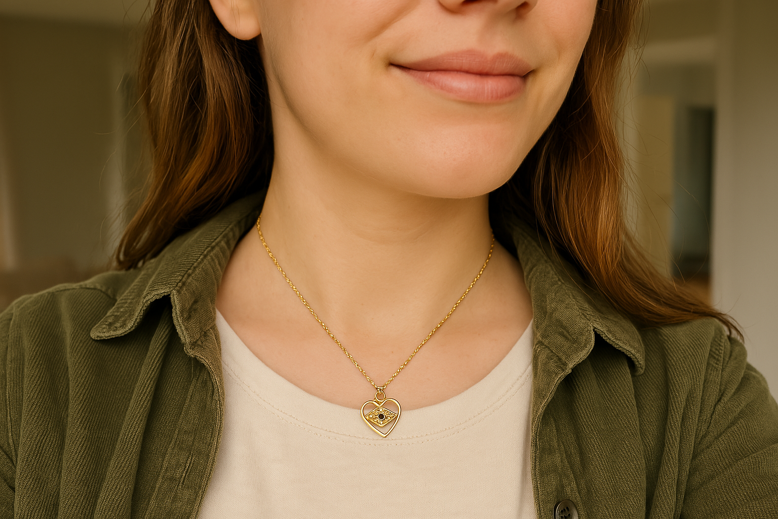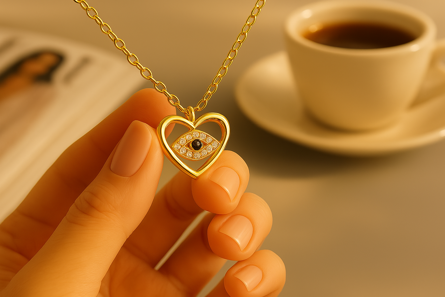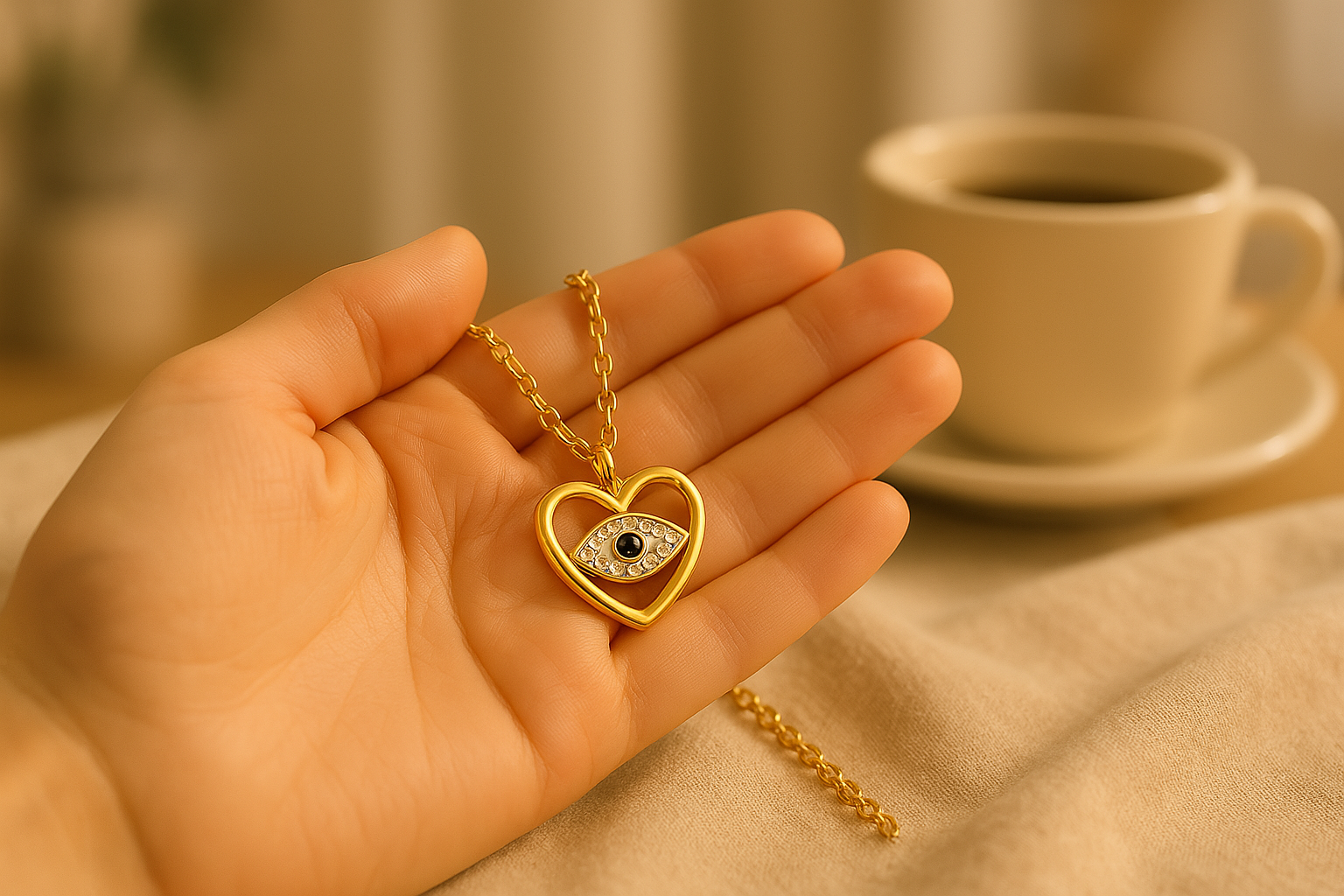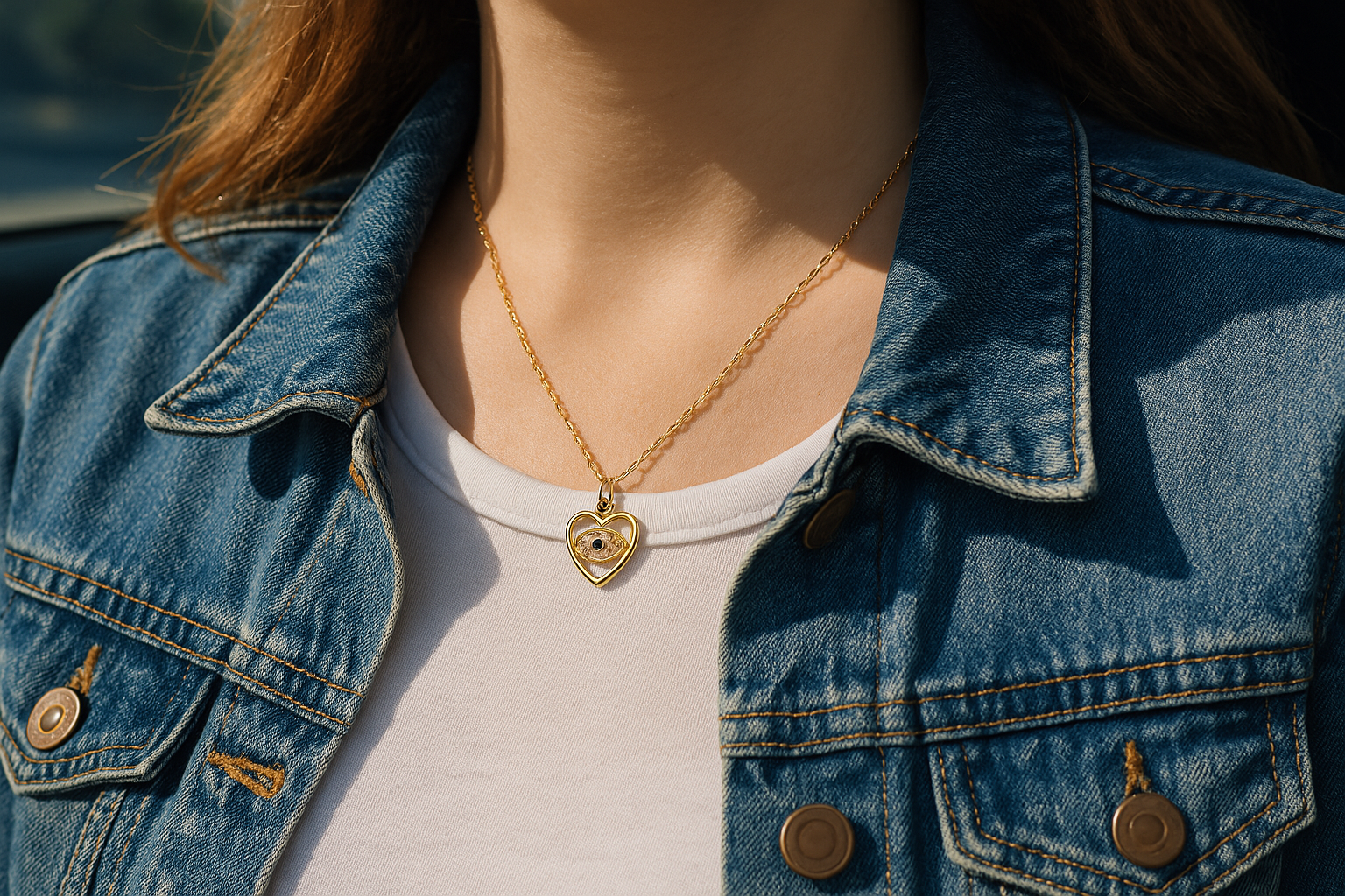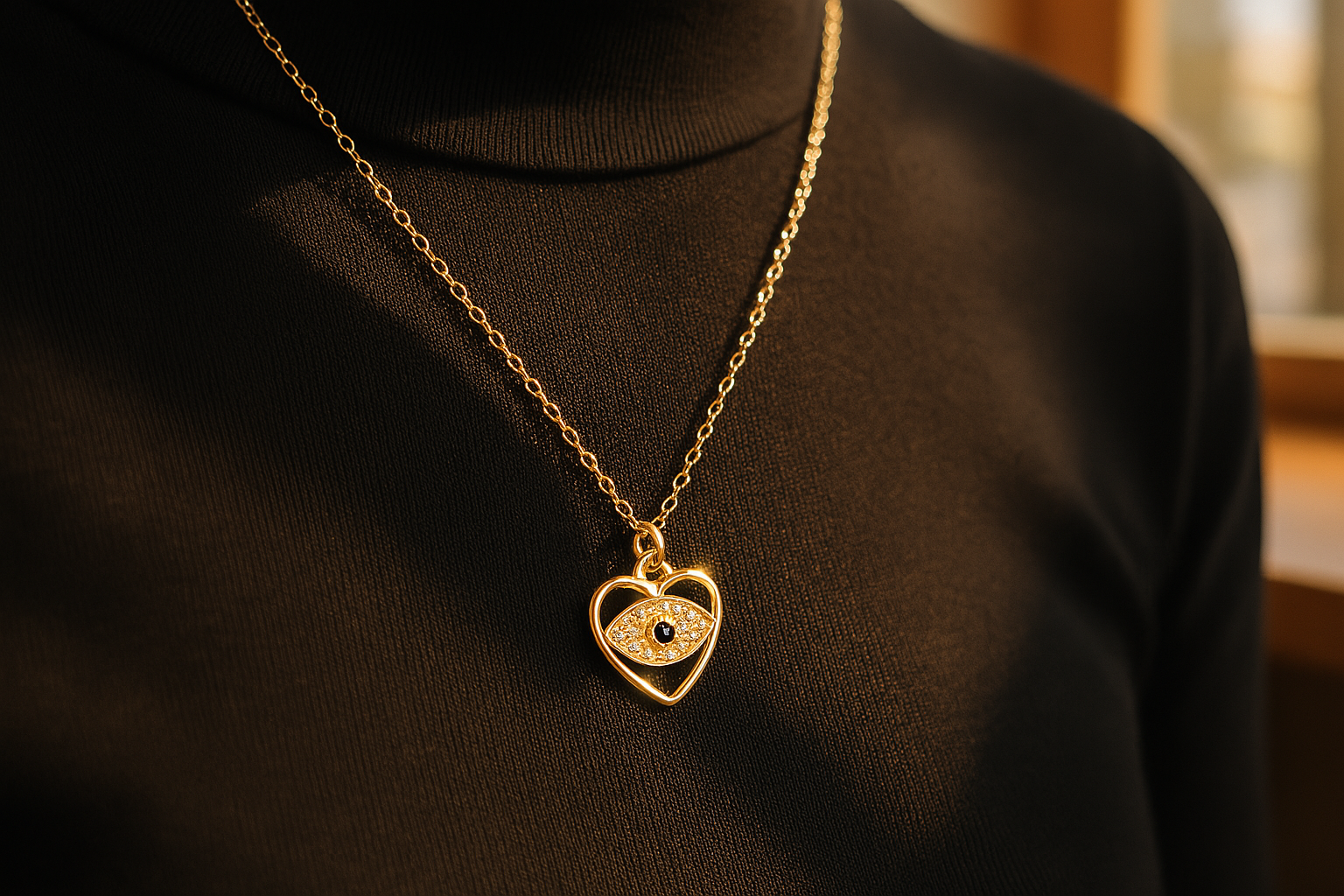 The Gold Evil Eye Heart Charm blends two ancient symbols — love and protection — into one modern statement. With brilliant zircon detailing and a compact size of 16x12.5x2mm, it adds elegance and spiritual energy to your accessory creations.