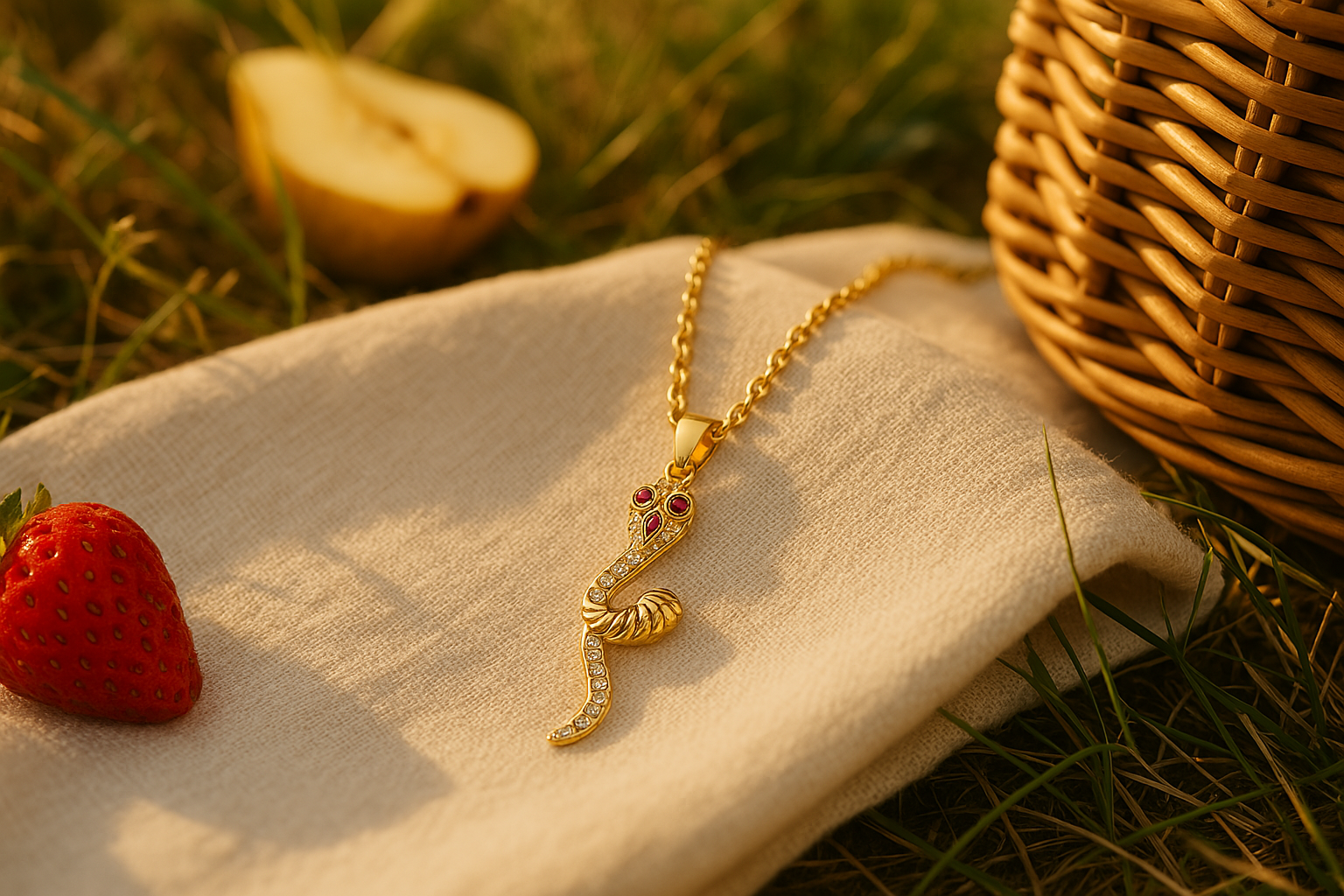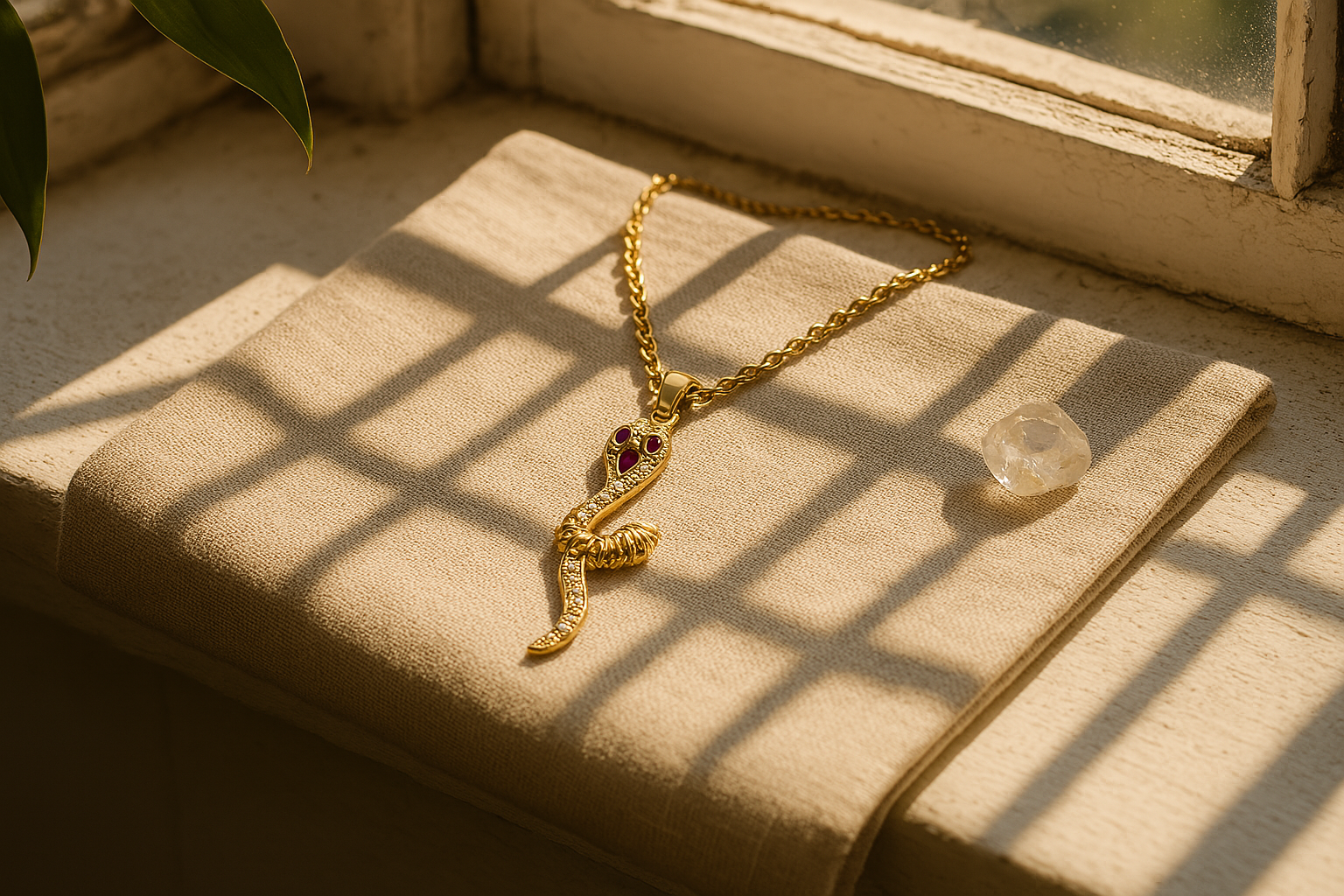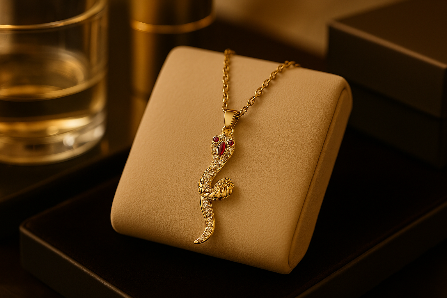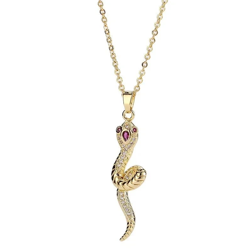 Make a statement that’s both ancient and timeless. The Gold Snake Pendant Necklace channels the powerful symbolism of transformation, inner strength, and wisdom. Crafted in glowing 18k gold-plated sterling silver, the snake’s body is encrusted with shimmering stones, while the striking red crystal eyes add a touch of mystique.