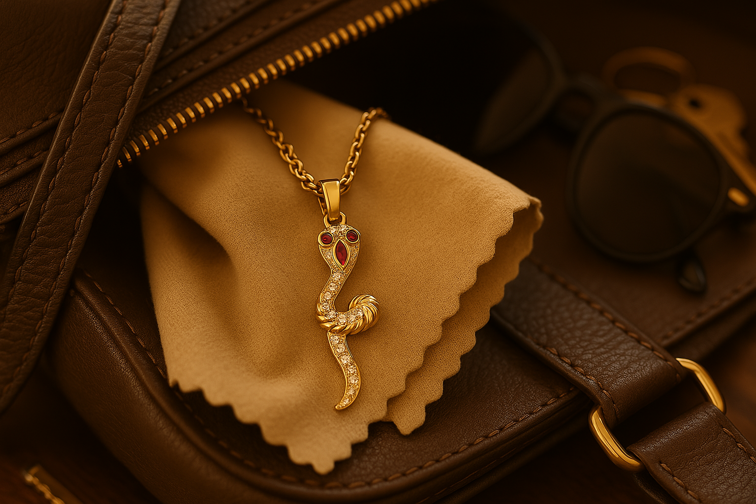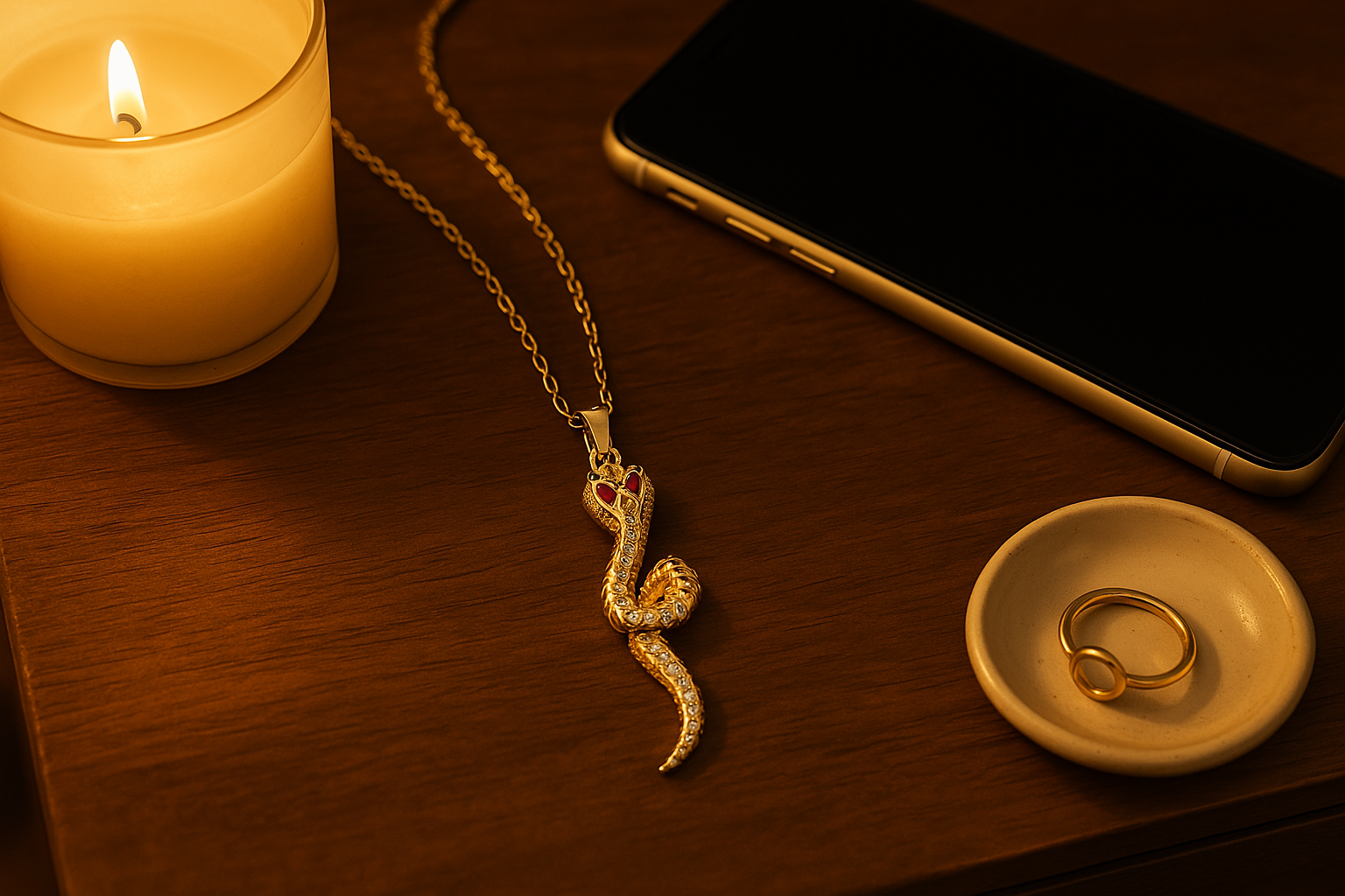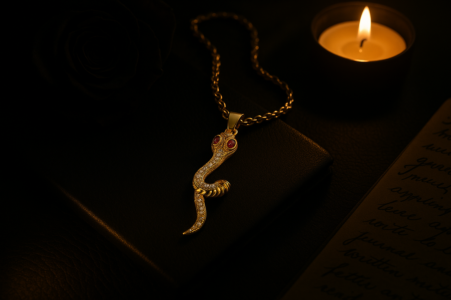 Make a statement that’s both ancient and timeless. The Gold Snake Pendant Necklace channels the powerful symbolism of transformation, inner strength, and wisdom. Crafted in glowing 18k gold-plated sterling silver, the snake’s body is encrusted with shimmering stones, while the striking red crystal eyes add a touch of mystique.