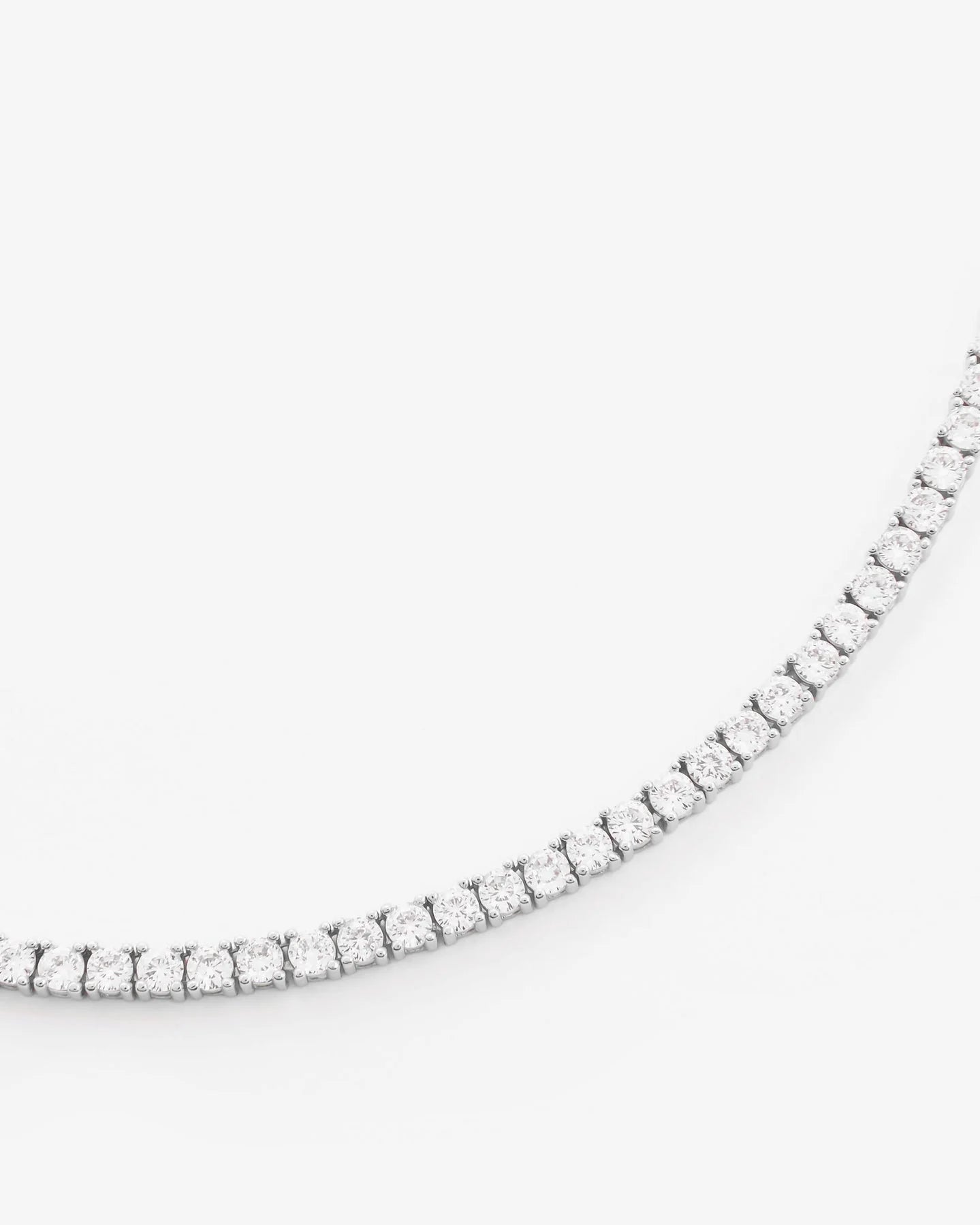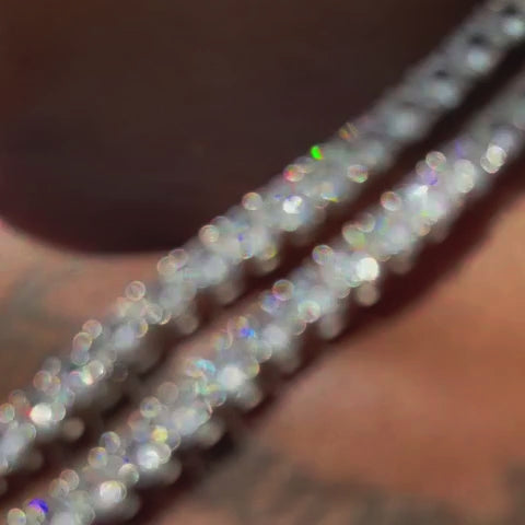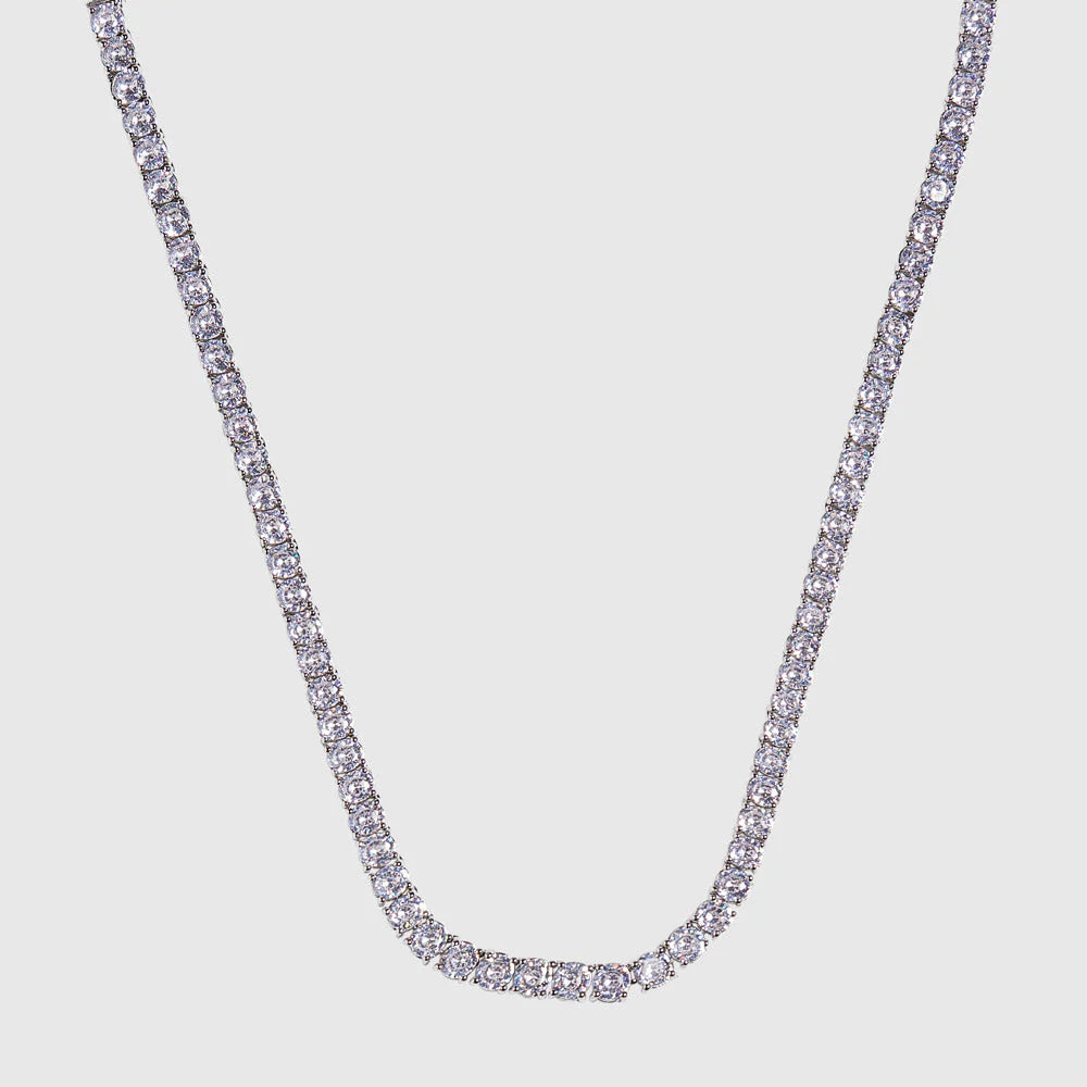 Serve looks with this icy piece. The silver 4mm Tennis Chain is fully iced-out with handset lab simulated CZ stones and a secure box clasp. It remains effortless and durable as a classic accessory that goes with anything.